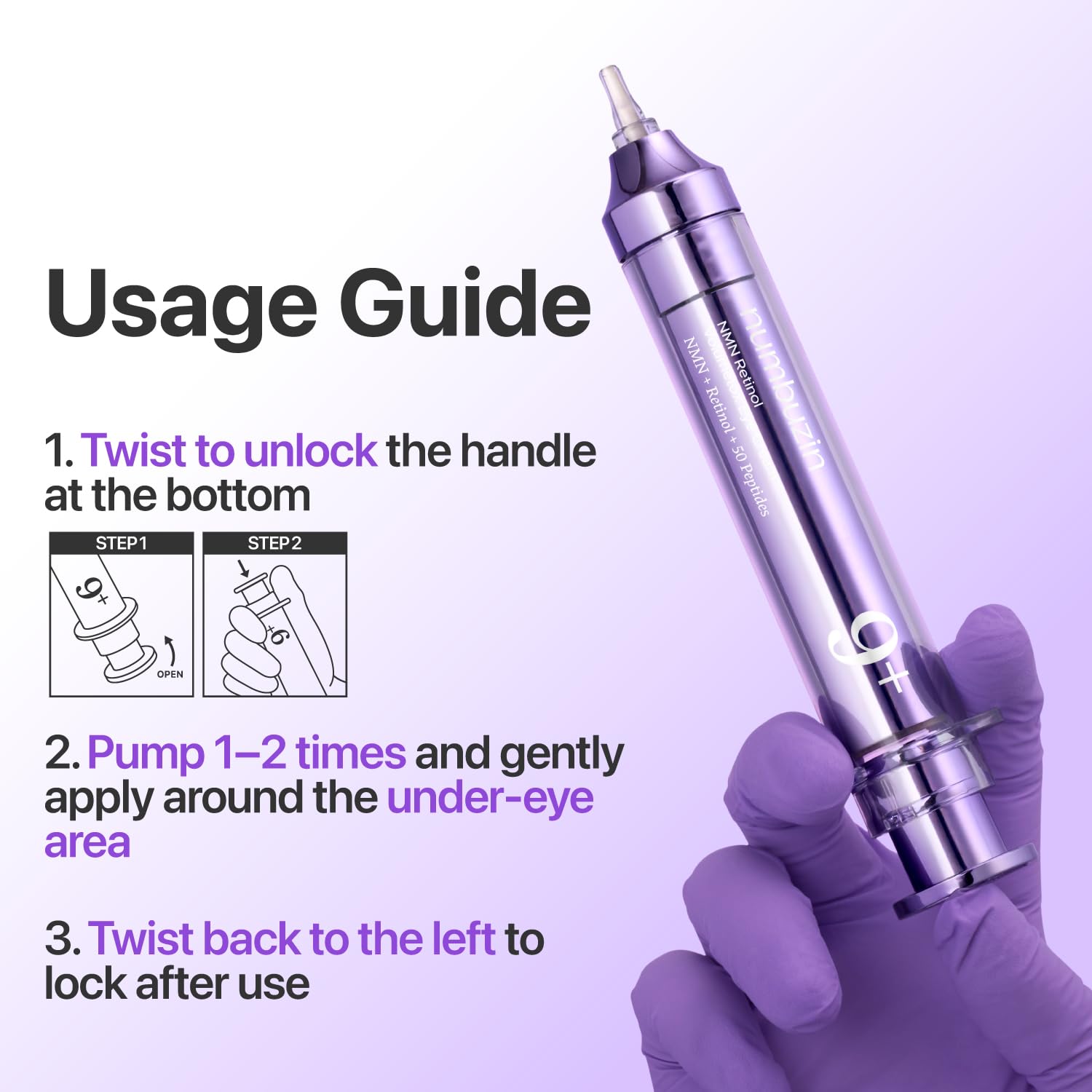 1. Twist the handle at the bottom to the right to open. 2. Open the cap, pump 1-2 times, and apply evenly around the under-eye area. 3. Twist the handle to the left to close.
